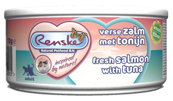 Renske Vers Maaltijd met verse tonijn en zalm voor katten. Door een hoog gehalte verse tonijn, zeer licht verteerbaar en smakelijk!