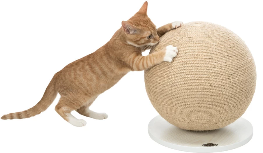 Sierlijke krabpaal gemaakt van sisal op een houten voet. Om de krabbol zit 4 mm sisaltouw. Uw kat kan rondom krabben.